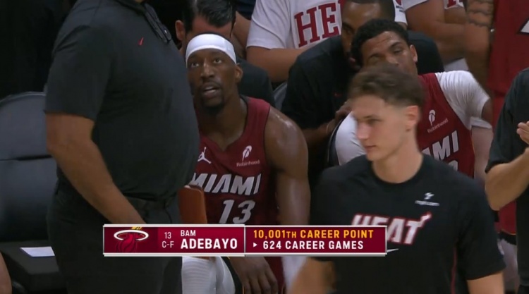 末节还剩5分钟,阿德巴约上篮命中,本场比赛个人砍下第24分;本场比赛之前是9977分,这样一来,他的生涯总得分来到10001分,用了624场比赛。