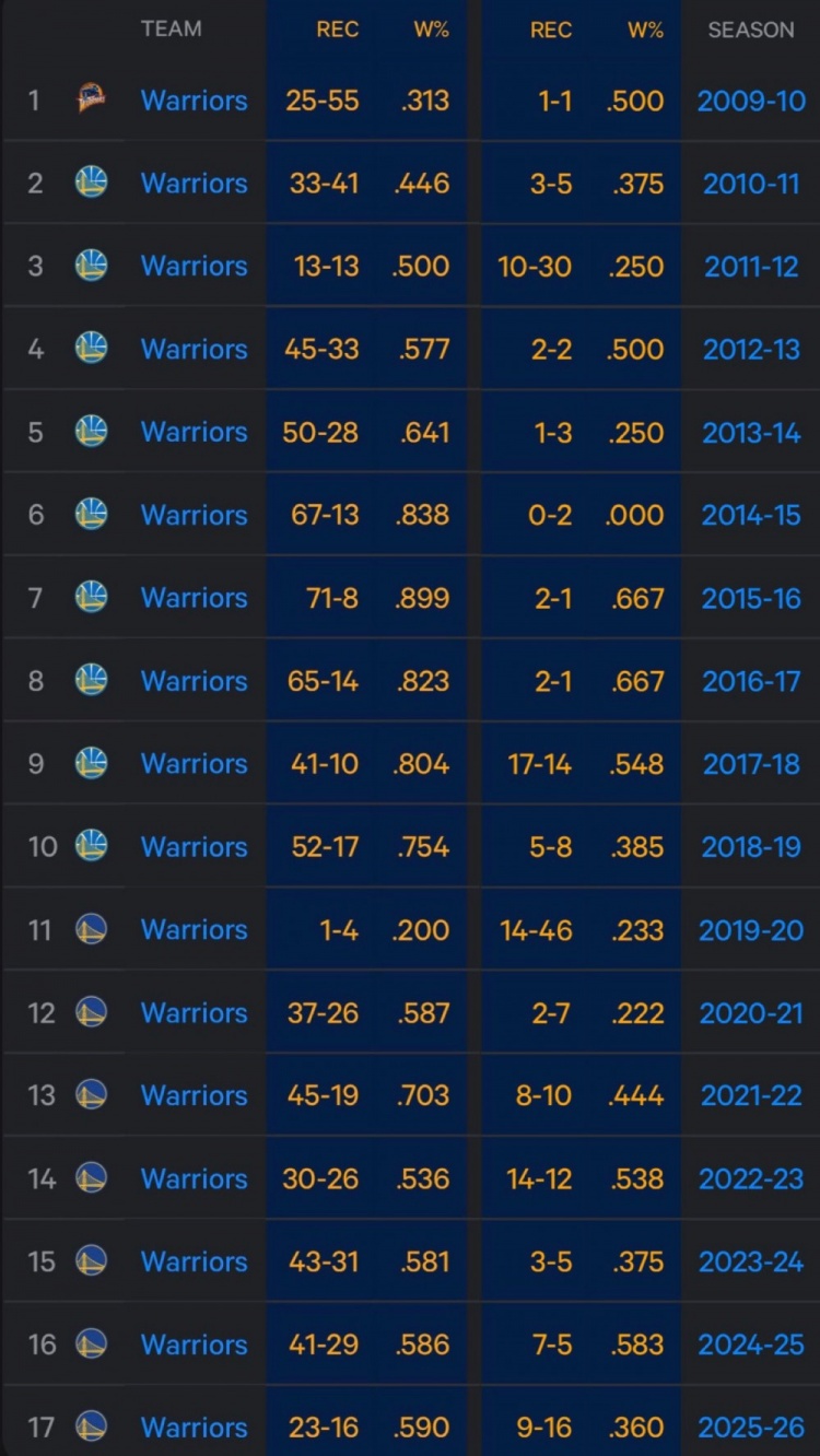 以2025-26赛季为例,库里出战时勇士战绩23-16,胜率59.0%