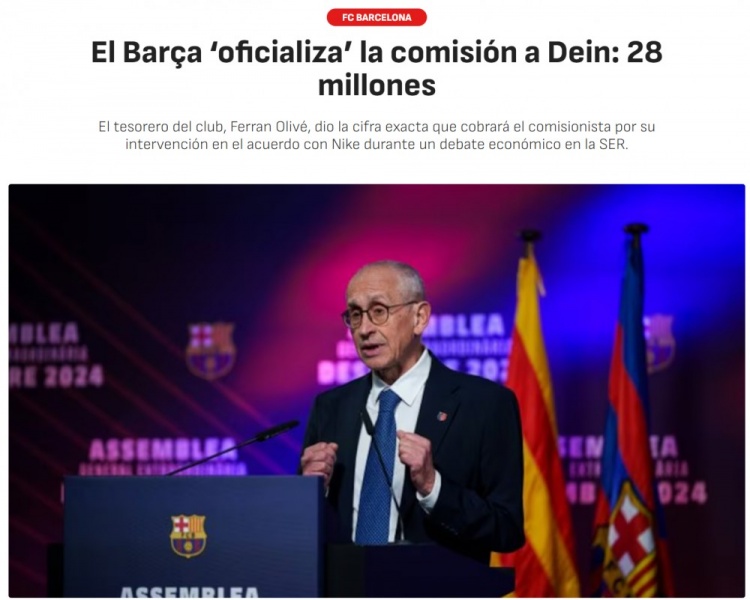 3月10日讯 巴萨财务主管费兰·奥利维在塞尔电台的辩论中透露,俱乐部给帮助他们与耐克达成新协议的经纪人达林·戴恩支付了2800万欧佣金。